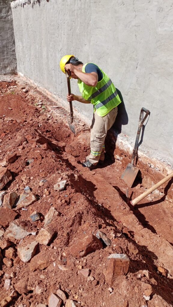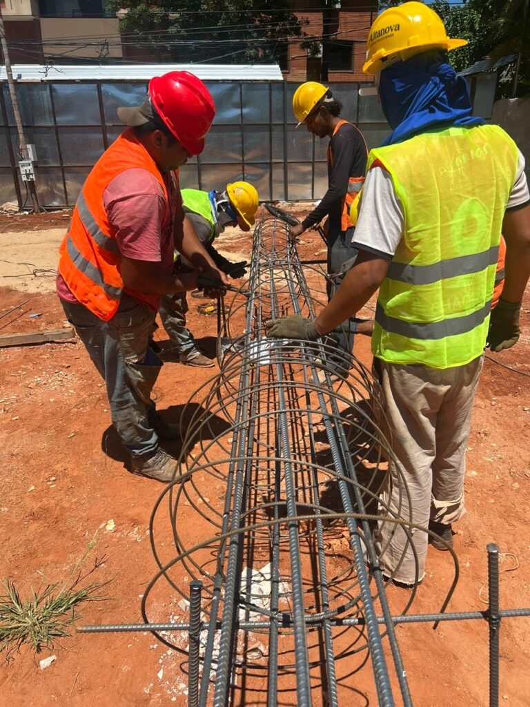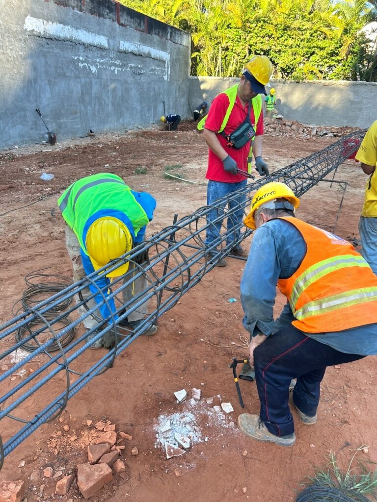 Durante este período se están realizando trabajos de limpieza de linderos y retiro de fundaciones existentes de la antigua propiedad, junto con la instalación de contenedores para el manejo de materiales. En paralelo, ya se ha iniciado la preparación de armaduras para pilotes, paso previo a la ejecución de la pantalla de pilotes, conforme al diseño estructural del proyecto.